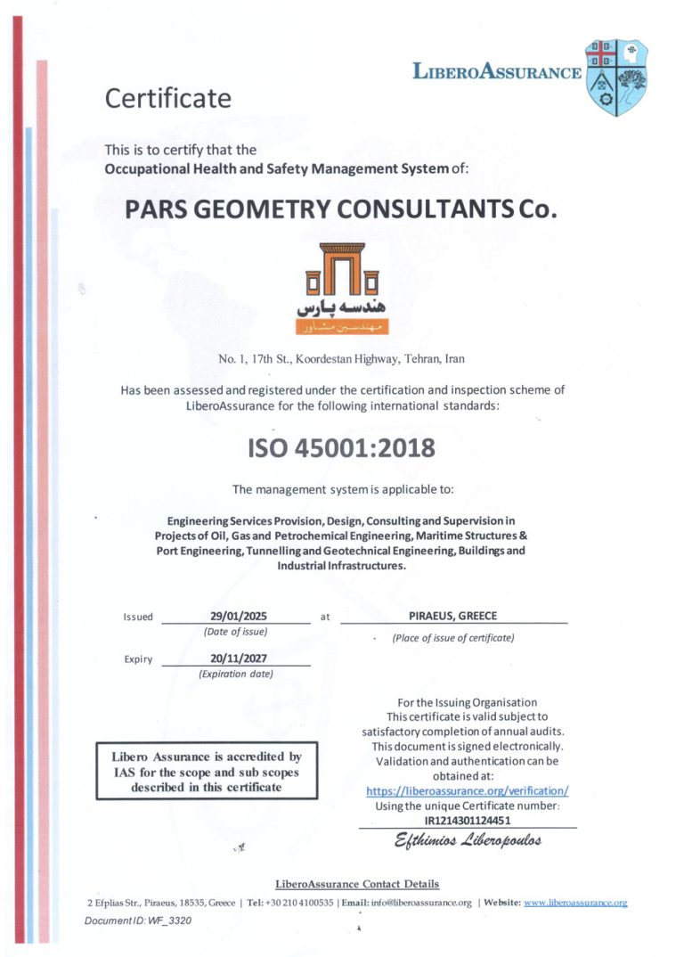 مهندسین مشاور هندسه پارس موفق به اخذ گواهینامه استاندارد ISO 45001:2018 (سیستم مدیریت ایمنی و بهداشت حرفه ای) از شرکت Libero Assurance گردید. در این رابطه مدارک و دستورالعمل های مربوطه در این شرکت به کار گرفته می شود.