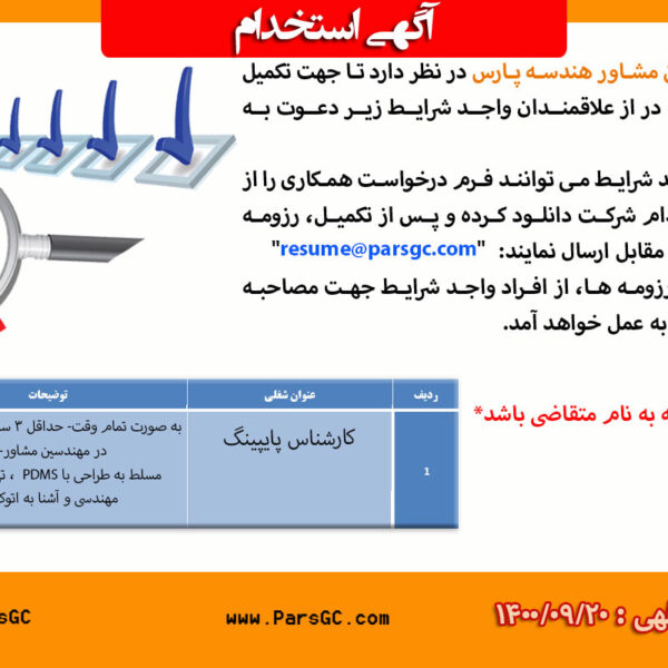 در حال حاضر شرکت مهندسین مشاور هندسه پارس جهت تکمیل کادر پرسنلی خود از فارغ التحصیلان دانشگاه های معتبر در مقاطع کارشناسی به بالا دعوت به همکاری می نماید.